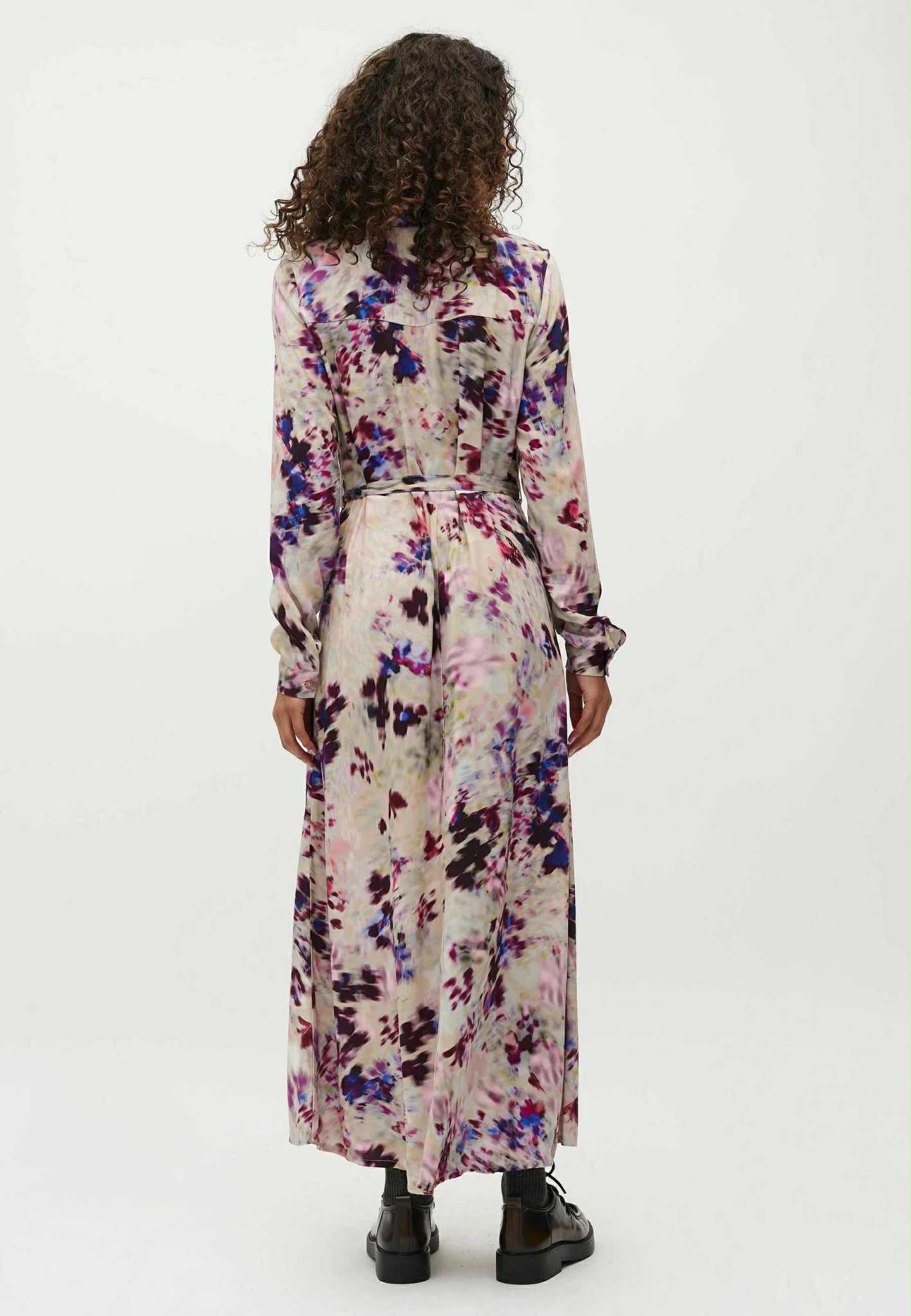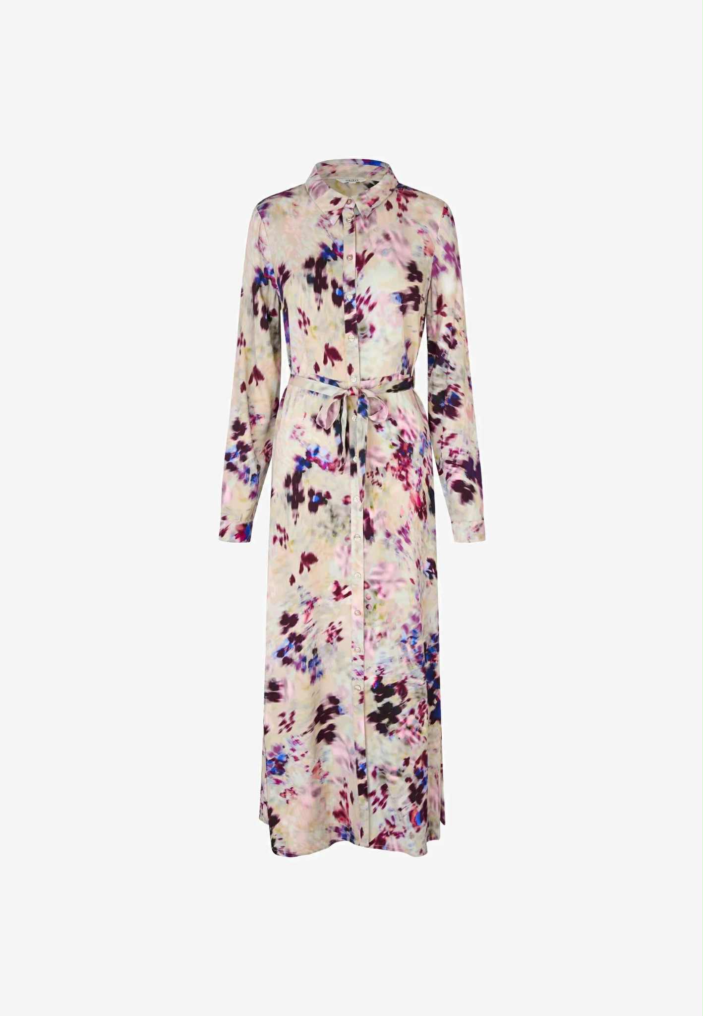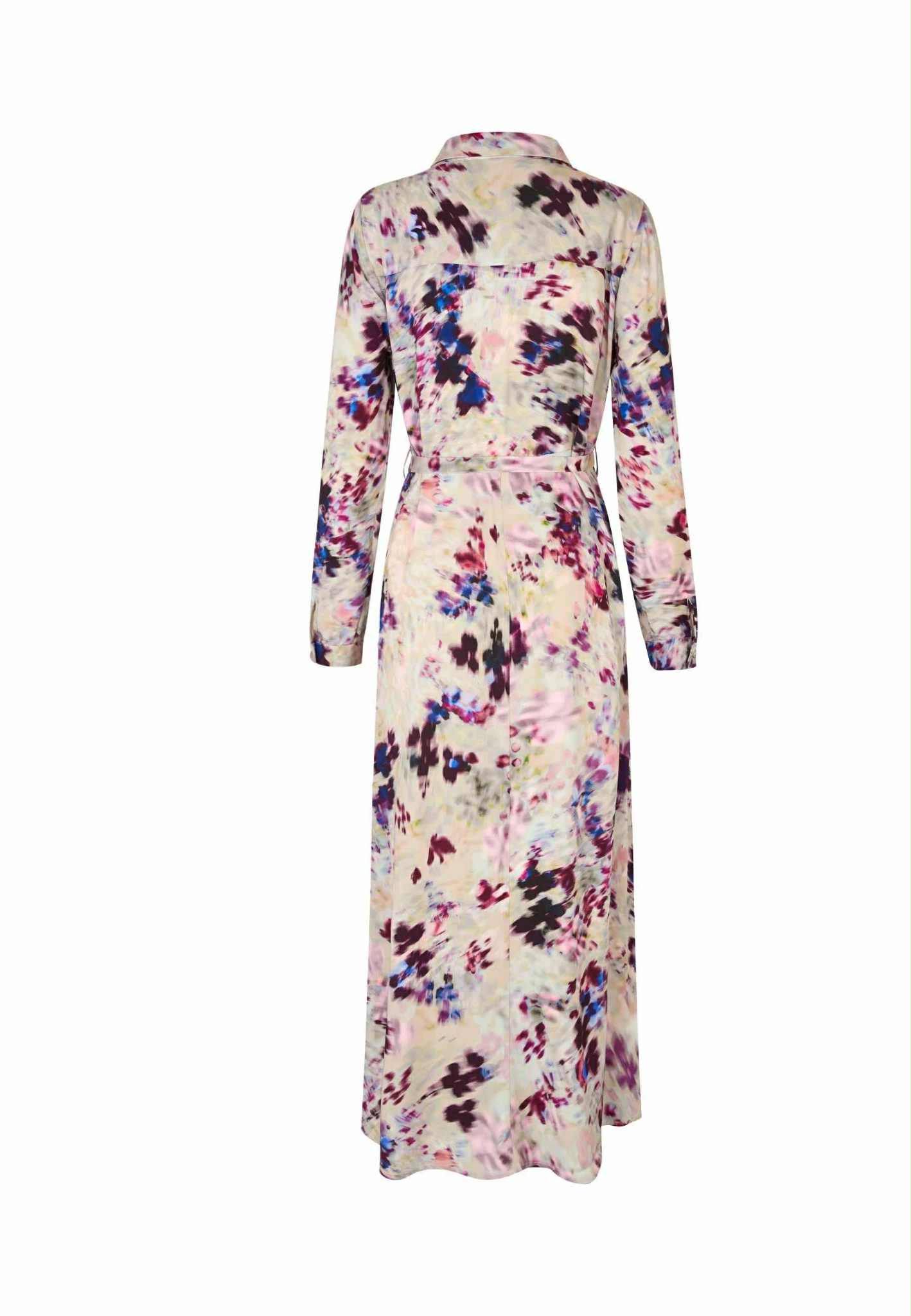 Klassískur síðerma skyrtukjóll frá danska merkinu mbyM. Hann er með skyrtukraga, hnepptur alla leið og með lausu mittisbandi sem hægt er að taka af. Dásamlegir litir