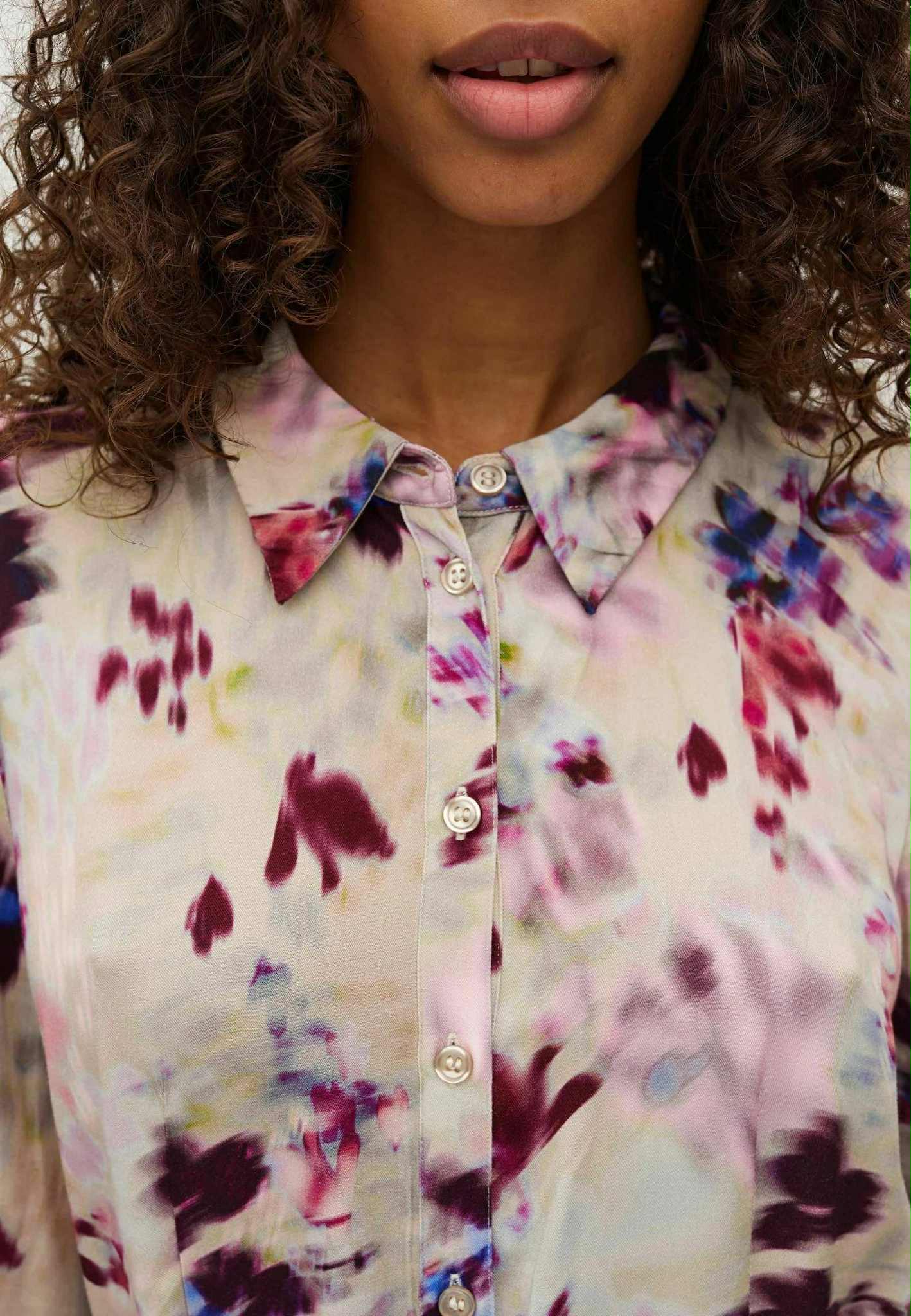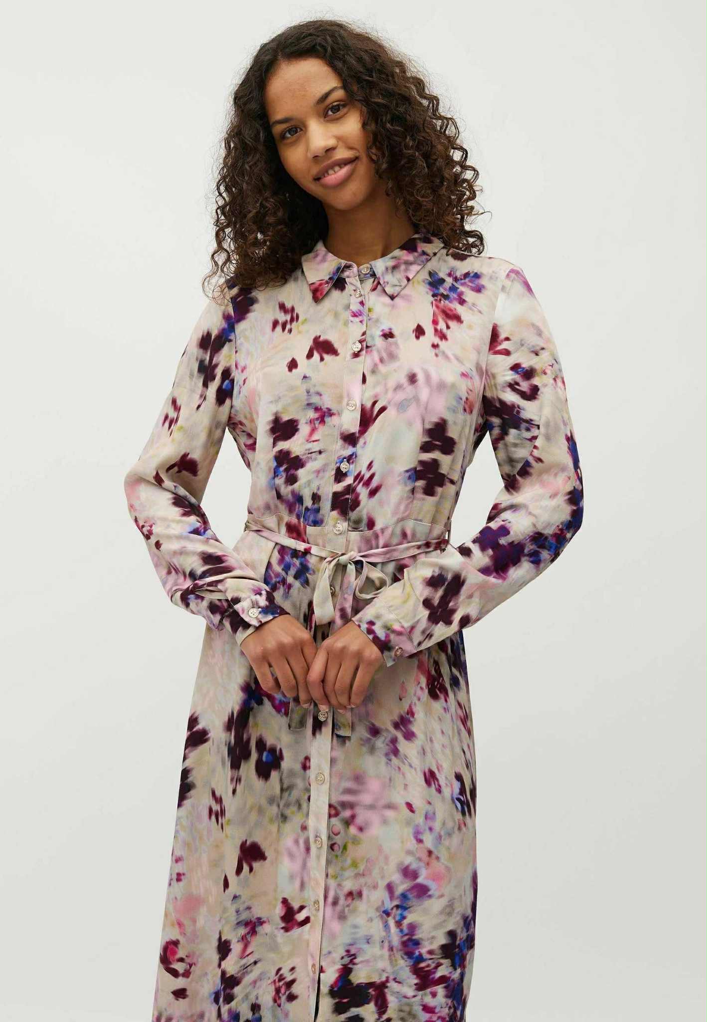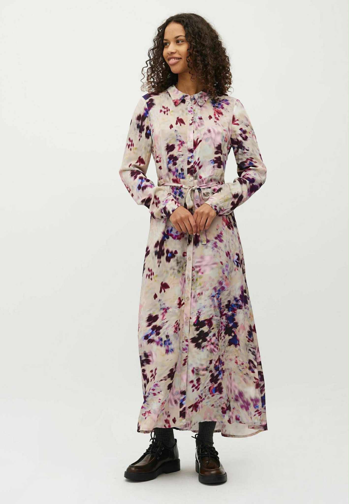 Klassískur síðerma skyrtukjóll frá danska merkinu mbyM. Hann er með skyrtukraga, hnepptur alla leið og með lausu mittisbandi sem hægt er að taka af. Dásamlegir litir