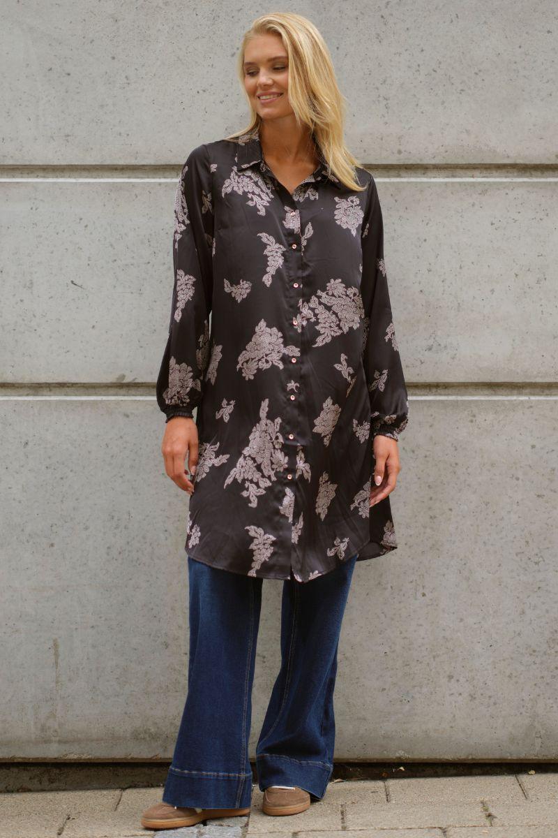 Skemmtilegur, víður skyrtukjóll frá danska merkinu Prepair. Hann er svartur, með stroffi á ermum og hnepptur alla leið. Hann er með vösum.
