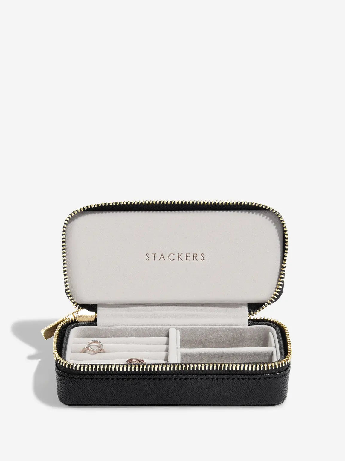 Nett og fallegt ferða skartgripaskrín frá Stackers sem er fullkomið fyrir ferðalagið. Leðurlíki að utan með flauelsfóðri að innan og lokast með gylltum rennilás.