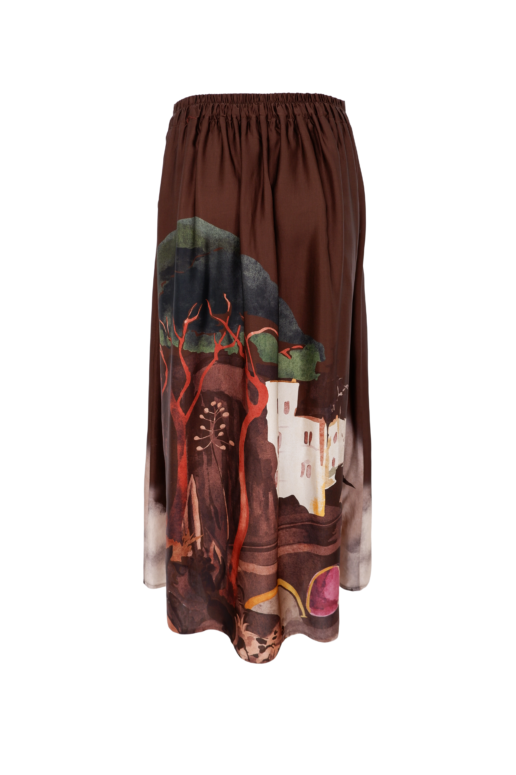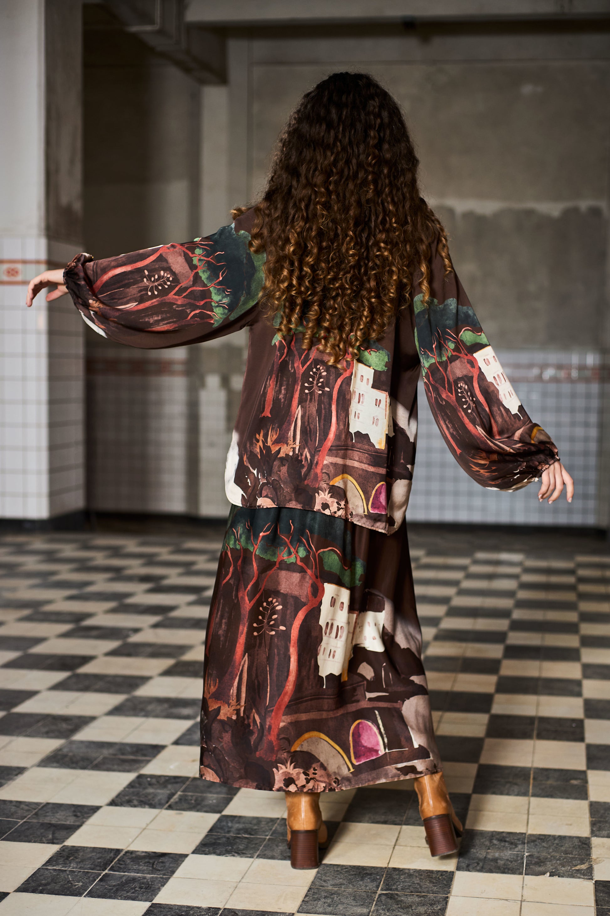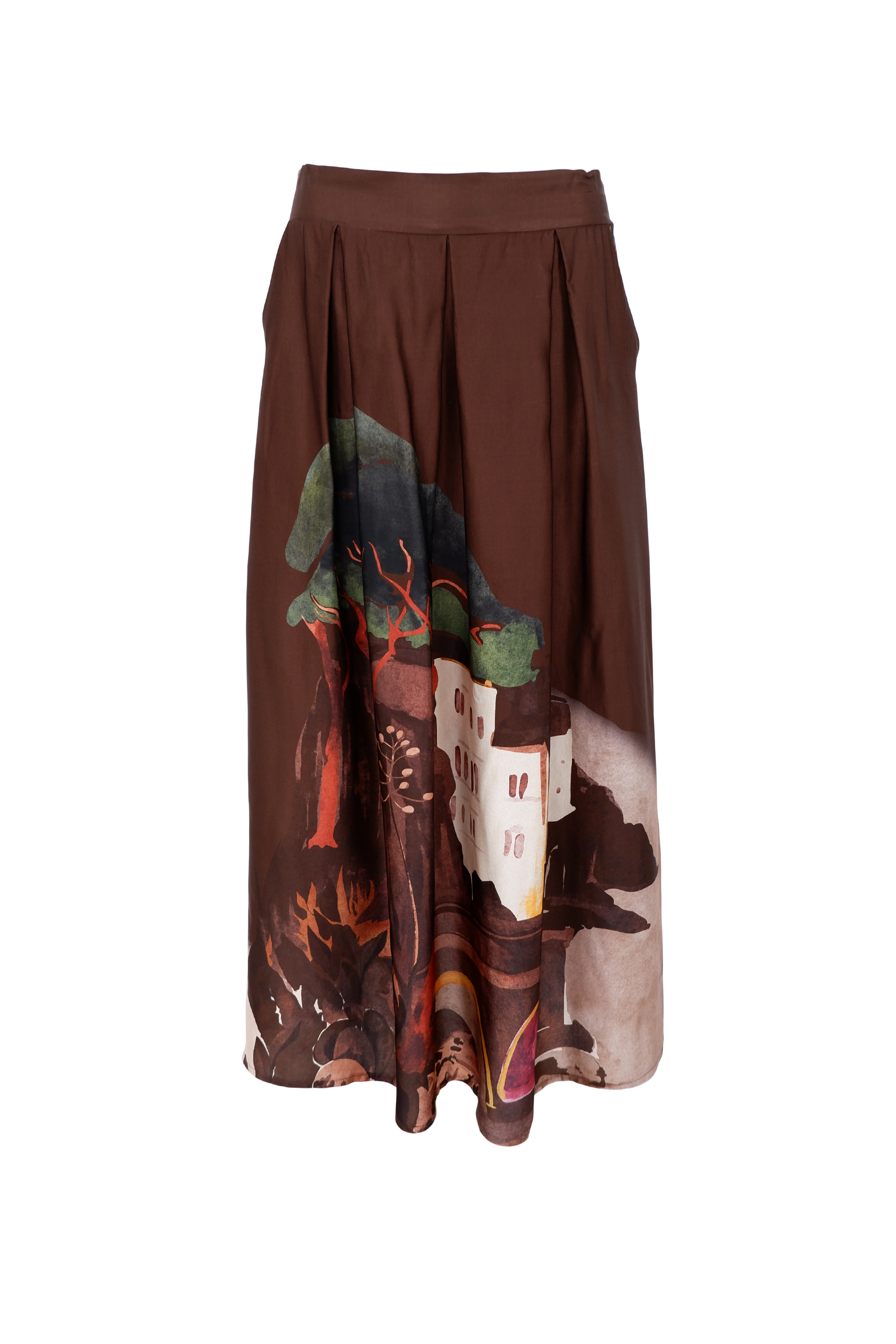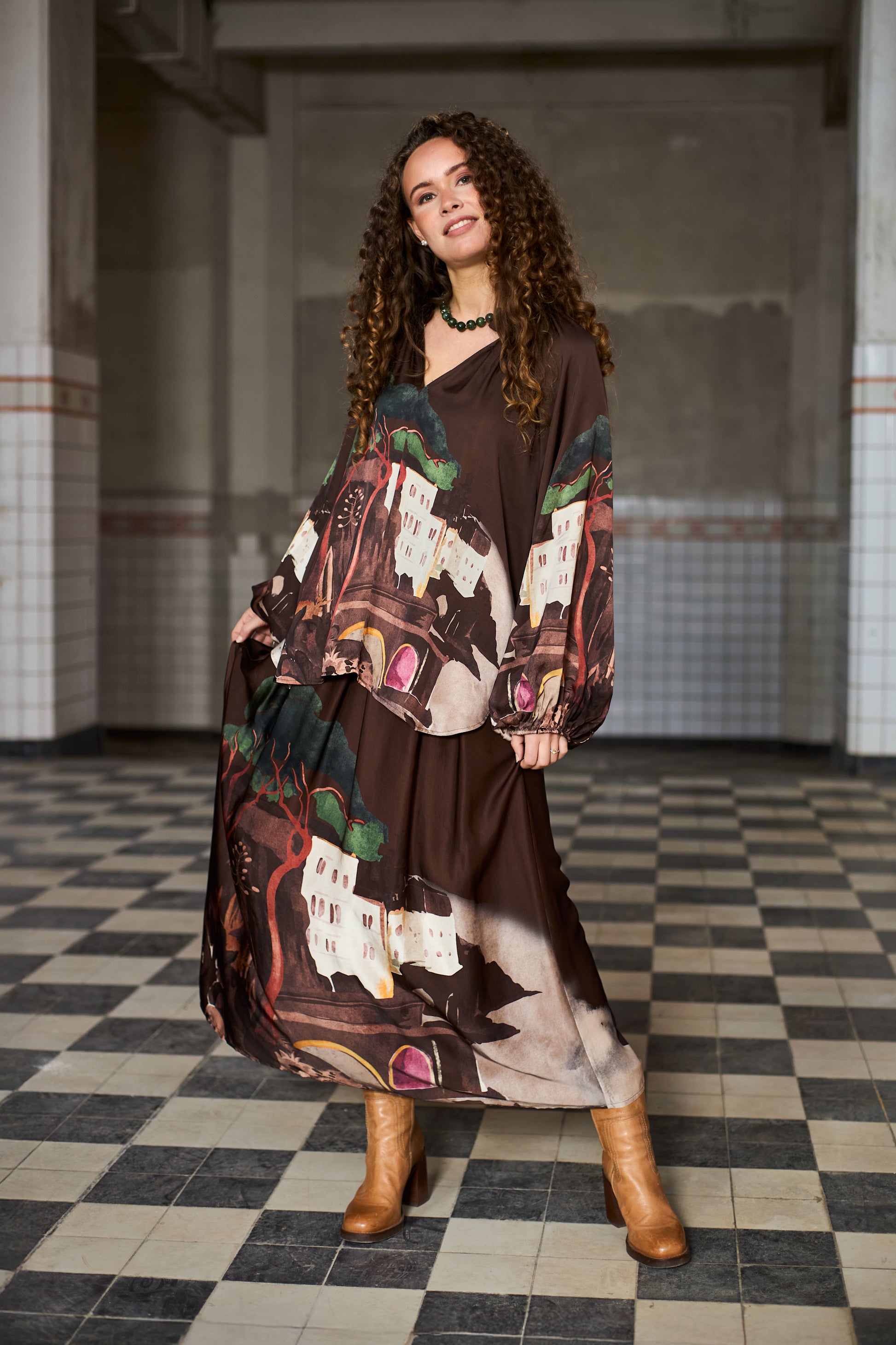 Síddin er rétt fyrir ofan ökkla, mikil og góð vídd er í pilsinu. Strengurinn er sléttur að framan en með teygju í bakið. Vasar eru á pilsinu. Hægt að klæða pilsið upp og niður en einnig kemur blússa í stíl.