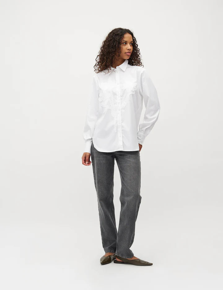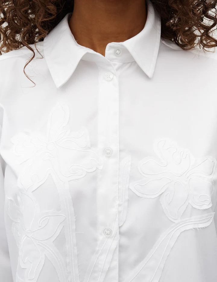 Klassískt snið með skyrtukraga og síðum ermum. Hneppt alveg niður. Fallegt blómamynstur er bróderað í skyrtuna að framan